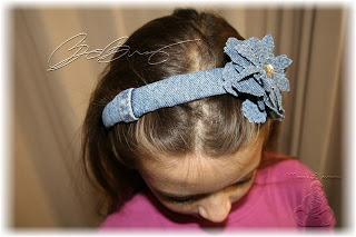 This is a quick fun craft for you and your little one – we used a pair of dad’s old tired jeans and cut a piece our to cover a plain headband – we wrapped the denim around and used a hot glue gun to hold it in place – I forgot to take a picture of the bottom side but I ran a piece of ribbon along the seam so that it looked cleaner.
